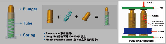 Pogo Pin是一種由針頭(Plunger)和針管(Tube)以及彈簧(Spring)三個(gè)基本部件通過(guò)精密儀器鉚壓之后形成的彈簧式探針,又稱(chēng)作彈簧針、彈簧頂針、彈簧探針、Spring Loaded、PogoPin連接器。Pogo Pin的針頭(Plunger)的底部通常是斜面結(jié)構(gòu),斜面結(jié)構(gòu)的作用是確保Pogo Pin在工作時(shí)保持針頭(Plunger)與針管(Tube)內(nèi)壁接觸,讓電流主要通過(guò)鍍金的針頭(Plunger)和針管(Tube)以確保Pogo Pin的穩(wěn)定及低阻抗。Pogo Pin一般應(yīng)用于手機(jī)、通訊、汽車(chē)、醫(yī)療、航空航天等電子產(chǎn)品中的精密連接;由于Pogo Pin是一個(gè)很精細(xì)的探針,體積可以做到非常小,所以應(yīng)用在精密連接器中可以降低連接器的重量、節(jié)省空間、美化產(chǎn)品外觀(如:超薄手機(jī),智能手表等產(chǎn)品)。
